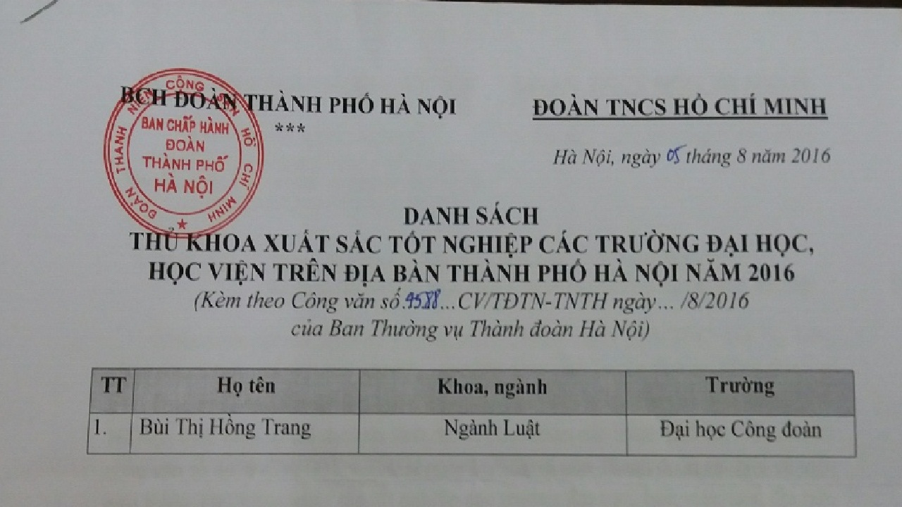 Thủ khoa xuất sắc Tốt nghiệp năm 2016