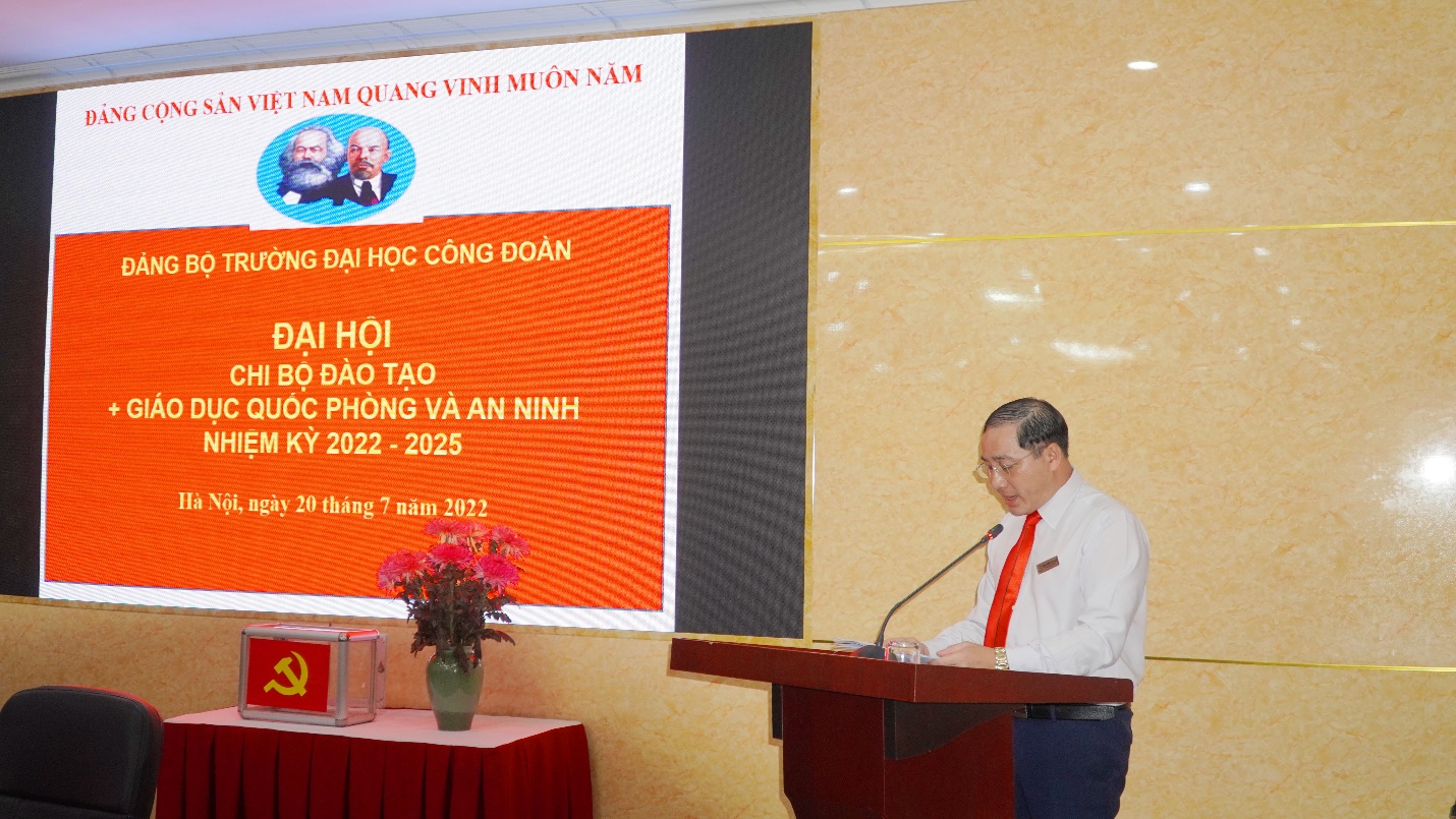 Đến dự và chỉ đạo Đại hội có đồng chí Lê Cao Thắng – Ủy viên BCH Tổng Liên đoàn, Bí thư Đảng ủy, Chủ tịch Hội đồng Trường; đồng chí Phạm Đức Thịnh – Ủy viên BCH Đảng ủy, Phó, Phụ trách Văn phòng Đảng ủy, Hội đồng Trường và đoàn thể. Đồng chí Bí thư Đảng ủy đánh giá rất cao những thành tích đã đạt được của Chi bộ; đồng thời chỉ ra những hạn chế, nguyên nhân và các giải pháp khắc phục; trên cơ sở đó, đồng chí đã nhấn mạnh nhiệm kỳ 2022-2025, Chi bộ cần tập trung 4 nội dung sau: (i) Tăng cường giáo dục chính trị tư tưởng cho toàn thể đảng viên; (ii) Chi bộ cần nâng cao vai trò, trách nhiệm trong tham mưu cho Lãnh đạo Nhà trường về đổi mới công tác đào tạo, nghiên cứu mô hình quản lý mới cho phù hợp với thực tế; (iii) Tham mưu về công tác mở ngành đào tạo và tuyển sinh cho Nhà trường; (iv) Chủ động phát triển, mở rộng đào tạo, bồi dưỡng ngắn hạn.