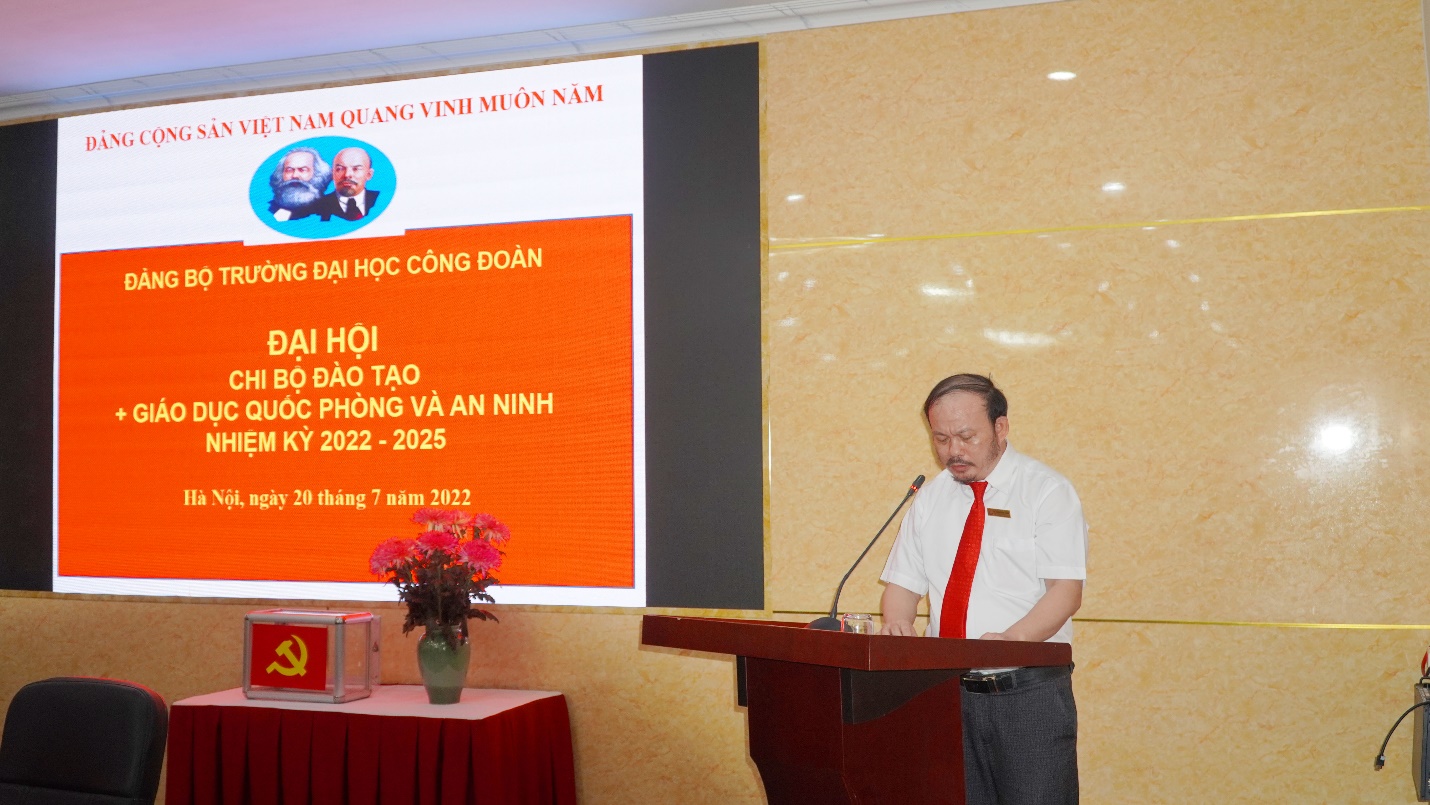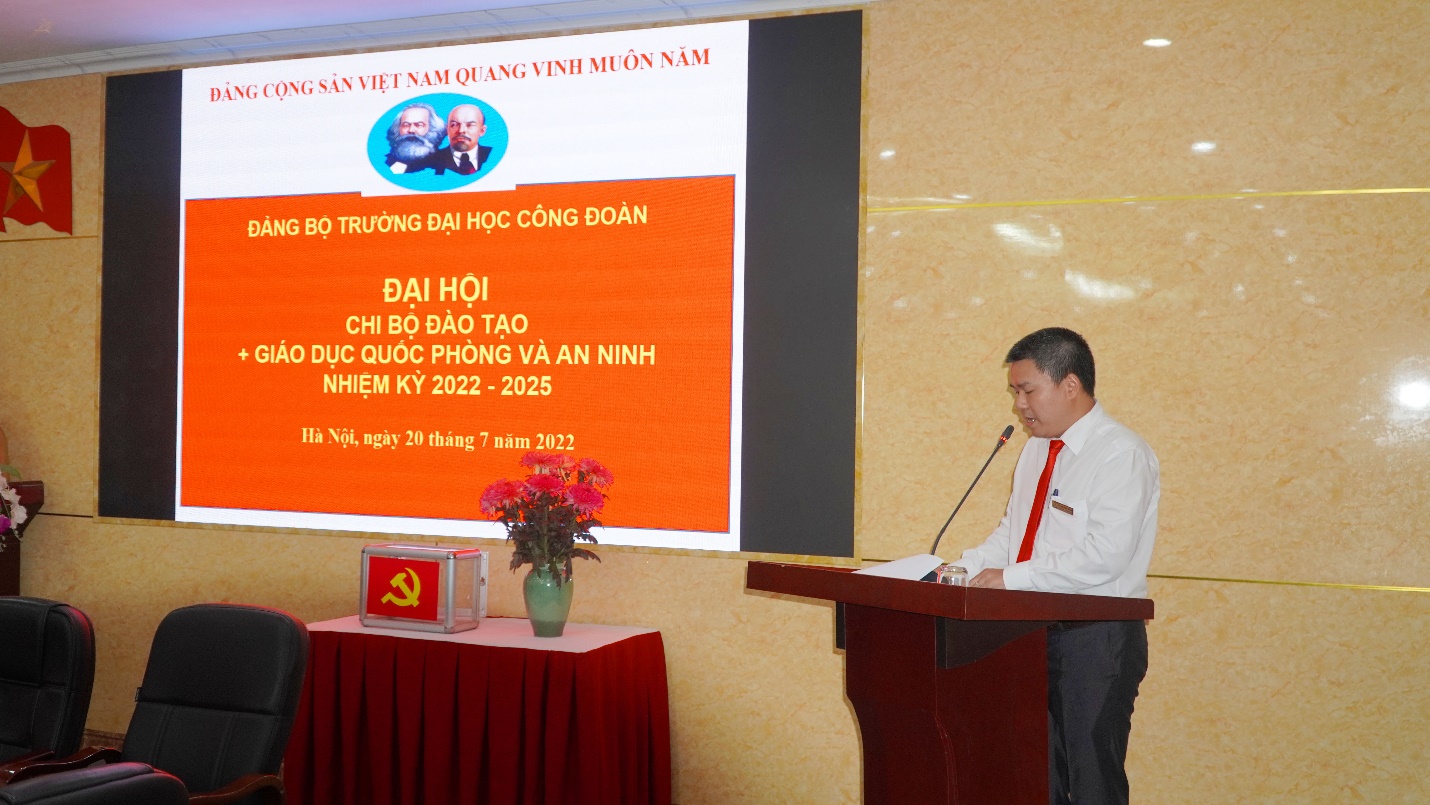 Thực hiện Kế hoạch số 11-KH/ĐU ngày 08/6/2022 của Đảng ủy Trường Đại học Công đoàn về tổ chức Đại hội chi bộ - nhiệm kỳ 2022-2025; được sự nhất trí của Đảng bộ Trường Đại học Công đoàn, Chi bộ Đào tạo + Giáo dục Quốc phòng và An ninh tiến hành Đại hội Chi bộ. Đại hội là diễn đàn chính trị quan trọng của Đảng, có nhiệm vụ đánh giá kết quả thực hiện Nghị quyết Đại hội chi bộ Đào tạo + Giáo dục quốc phòng và an ninh và quyết định phương hướng, nhiệm vụ và giải pháp nhằm nâng cao chất lượng hoạt động của chi bộ Đào tạo + Giáo dục quốc phòng và an ninh; đồng thời, bầu chi ủy, bí thư và phó bí thư nhiệm kỳ 2022-2025.
