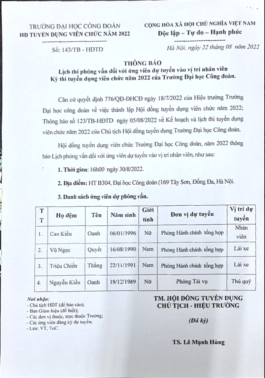 Lịch thi phỏng vấn đối ứng viên dự tuyển vào vị trí nhân viên