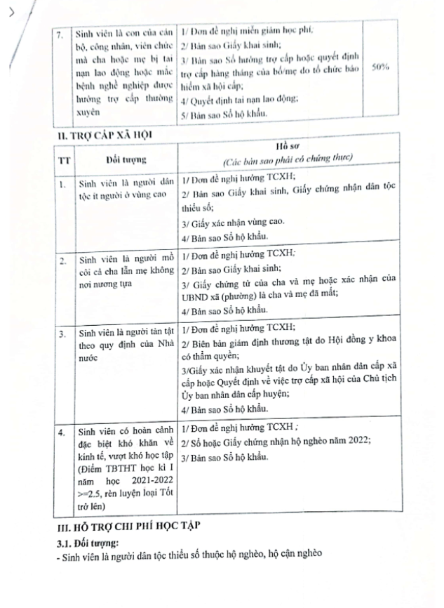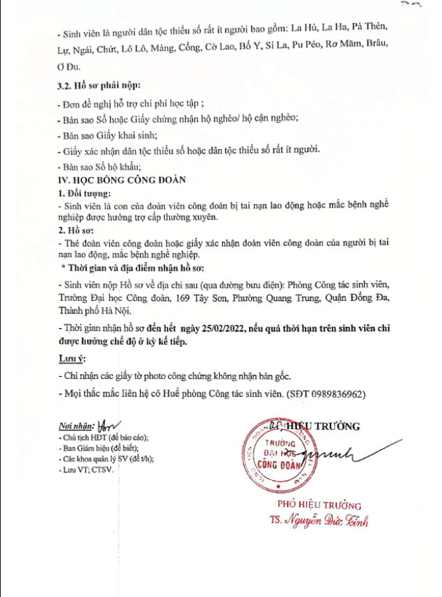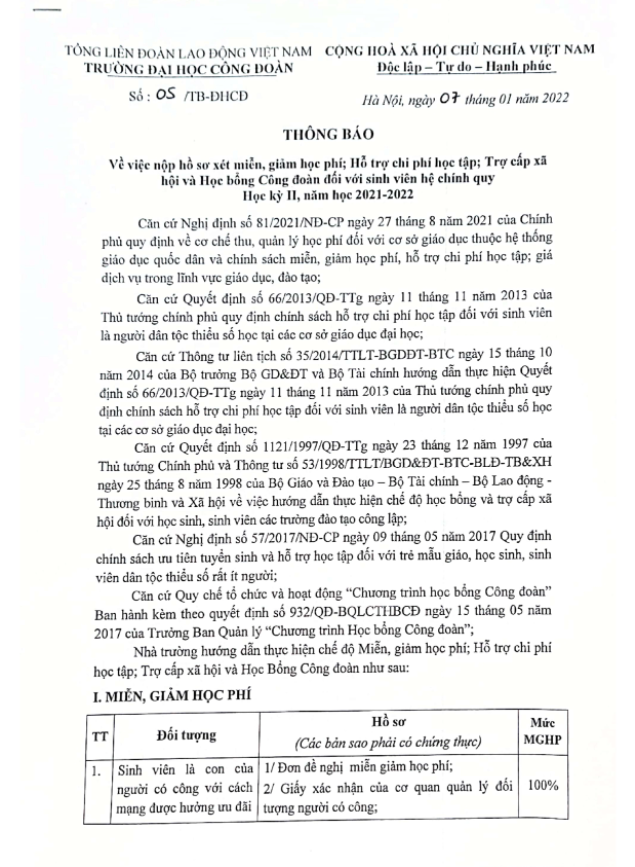Thông báo về việc nộp hồ sơ xét miễn, giảm học phí, hỗ trợ chi phí học tập, trợ cấp xã hội và học bổng Công Đoàn học kỳ II 2021-2022: