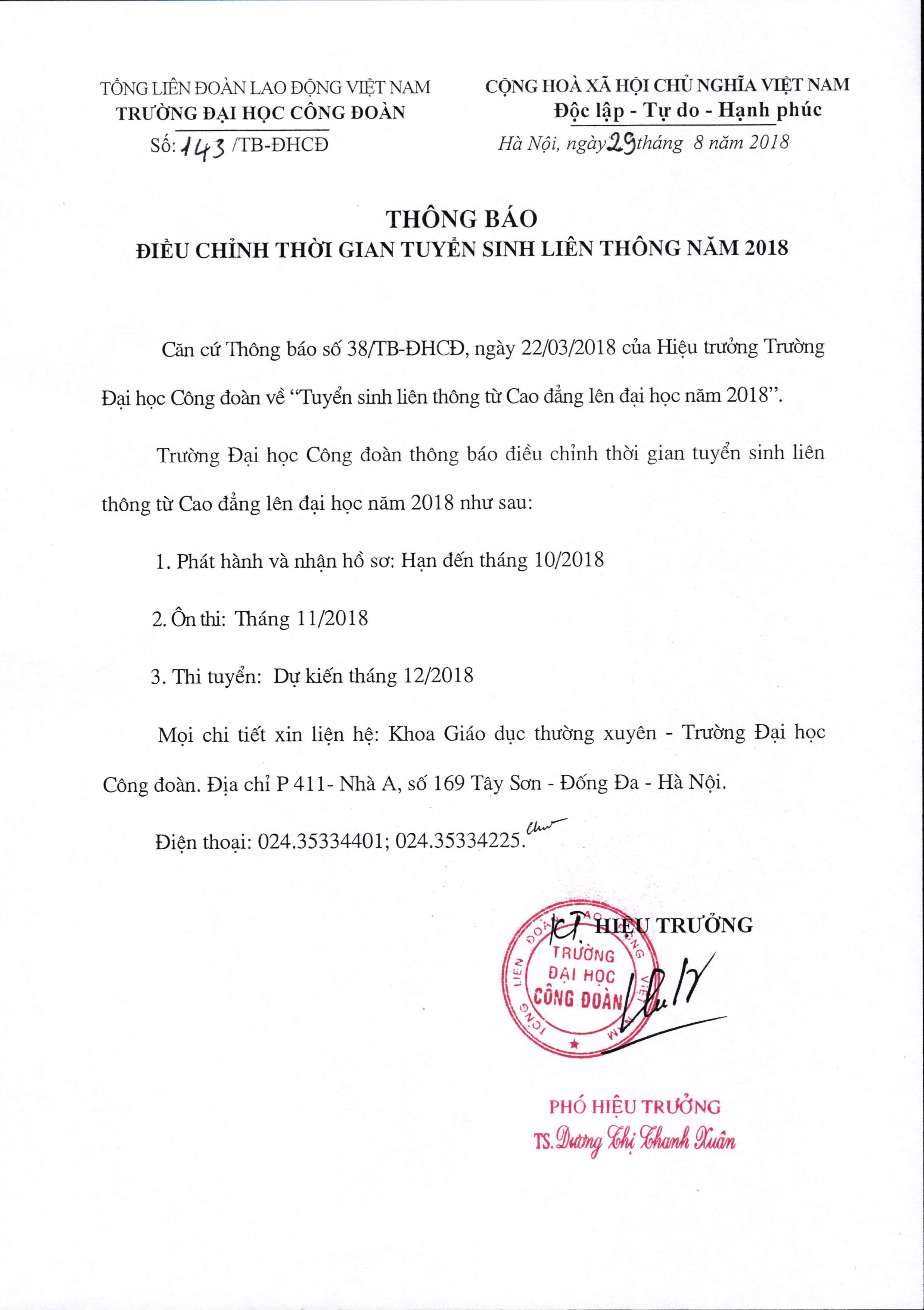 Thông báo điều chỉnh thời gian tuyển sinh Liên thông 2018
