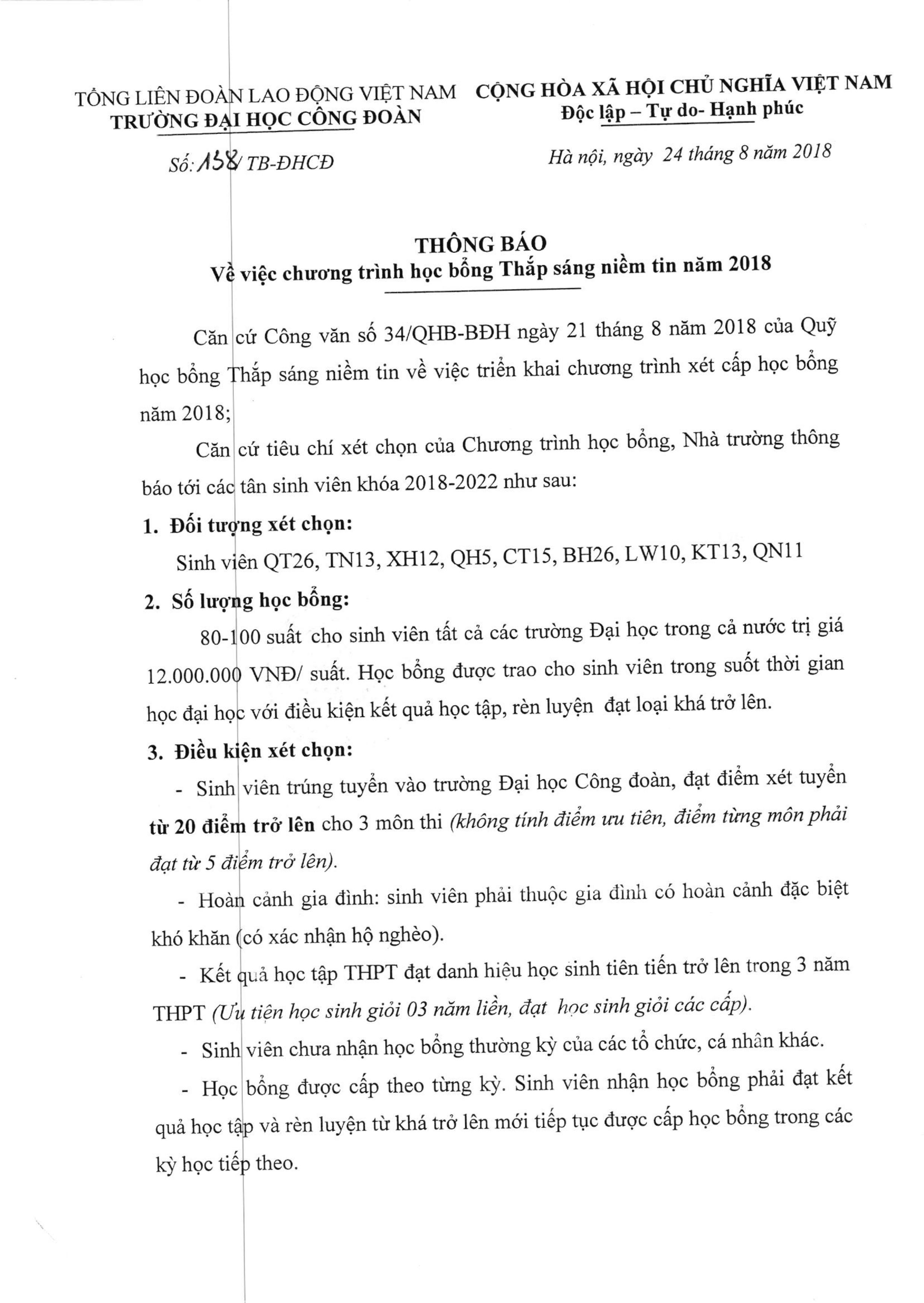 Danh sách Sinh viên nhận học bổng Công đoàn học kỳ II năm học 2017 - 2018