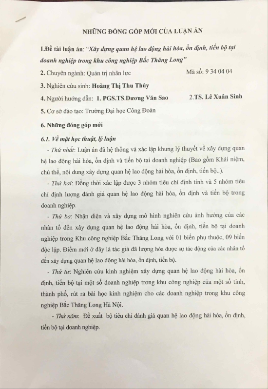 Luận án Tiến sĩ của NCS Hoàng Thị Thu Thủy: