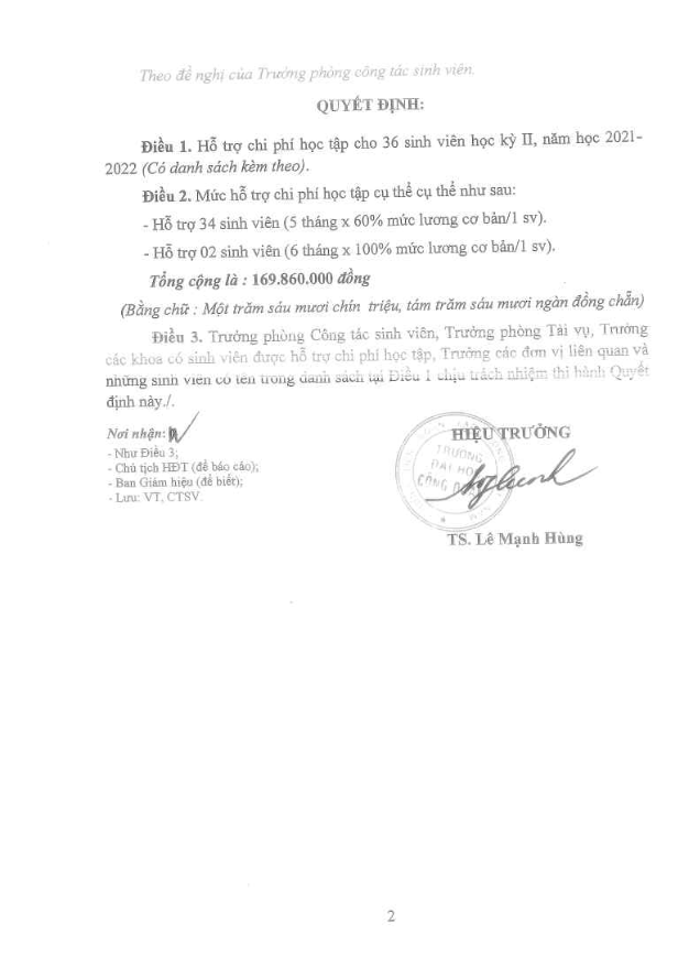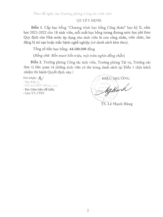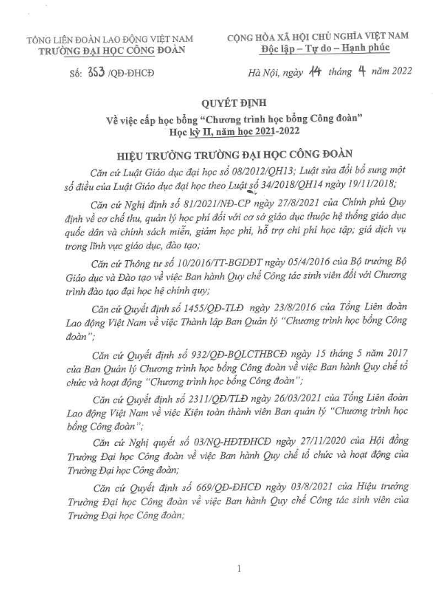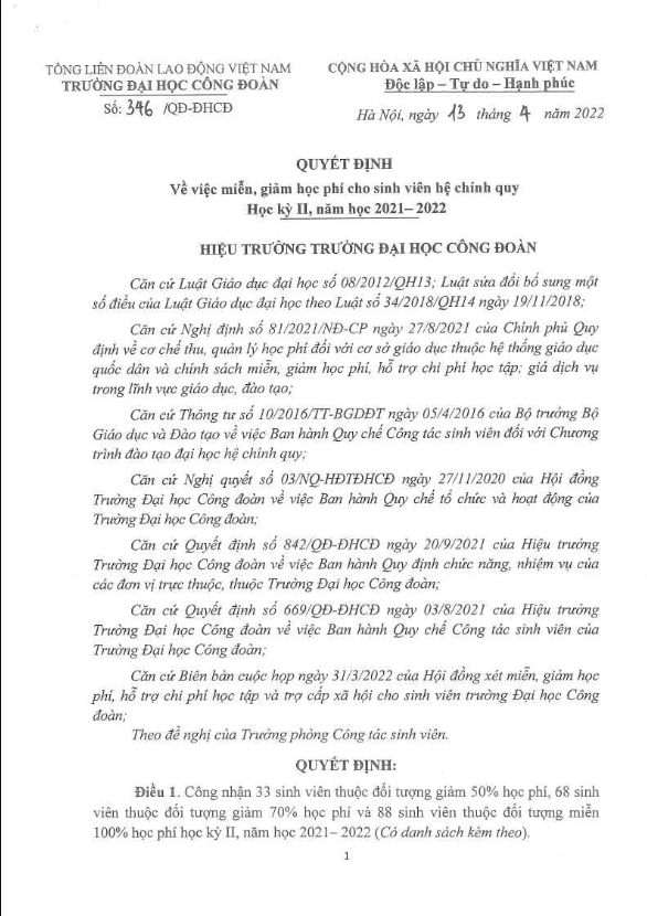 Quyết định về việc miễn,giảm học phí, trợ cấp xã hội, hỗ trợ chi phí học tập, học bổng công đoàn cho sinh viên hệ chính quy, học kỳ II, năm học 2021-2022