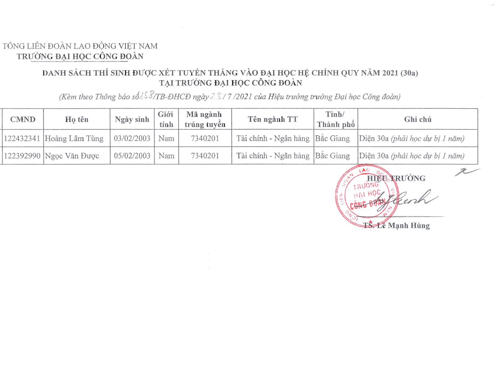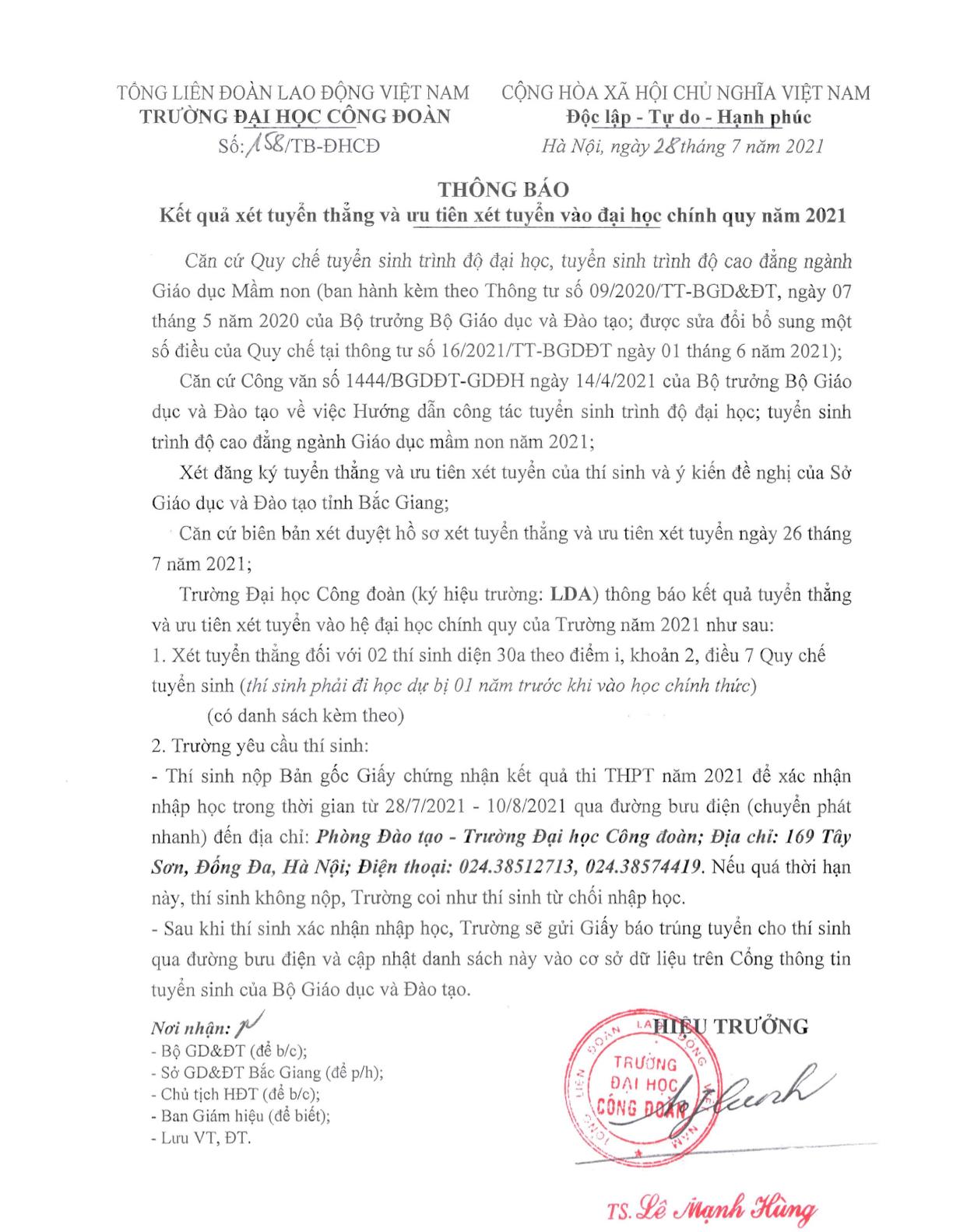 Thông báo kết quả xét tuyển thẳng và ưu tiên xét tuyển và đại học năm 2021