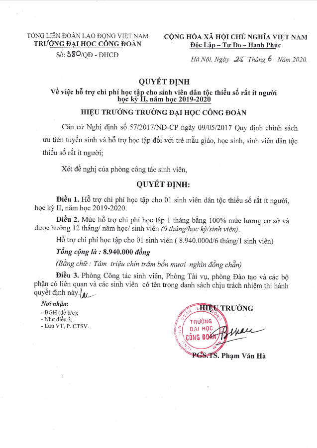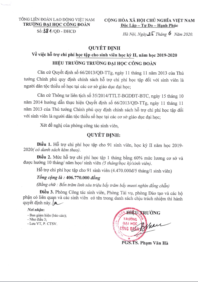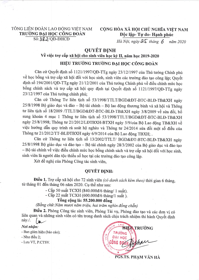Thống báo trợ cấp xã hội, hỗ trợ chi phí và miễn giảm học phí Học kỳ II 2019 - 2020