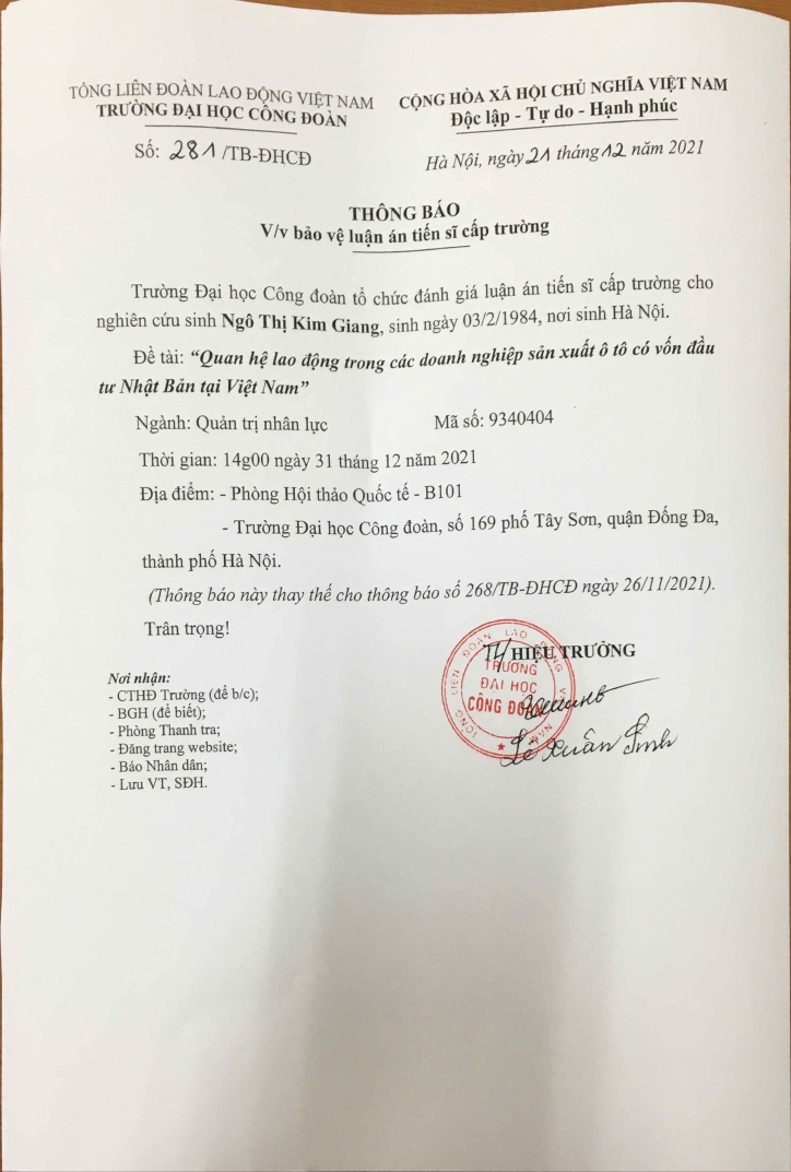 Thông báo về việc bảo vệ Luận án Tiến sĩ cấp trường ngày 31-12-2021