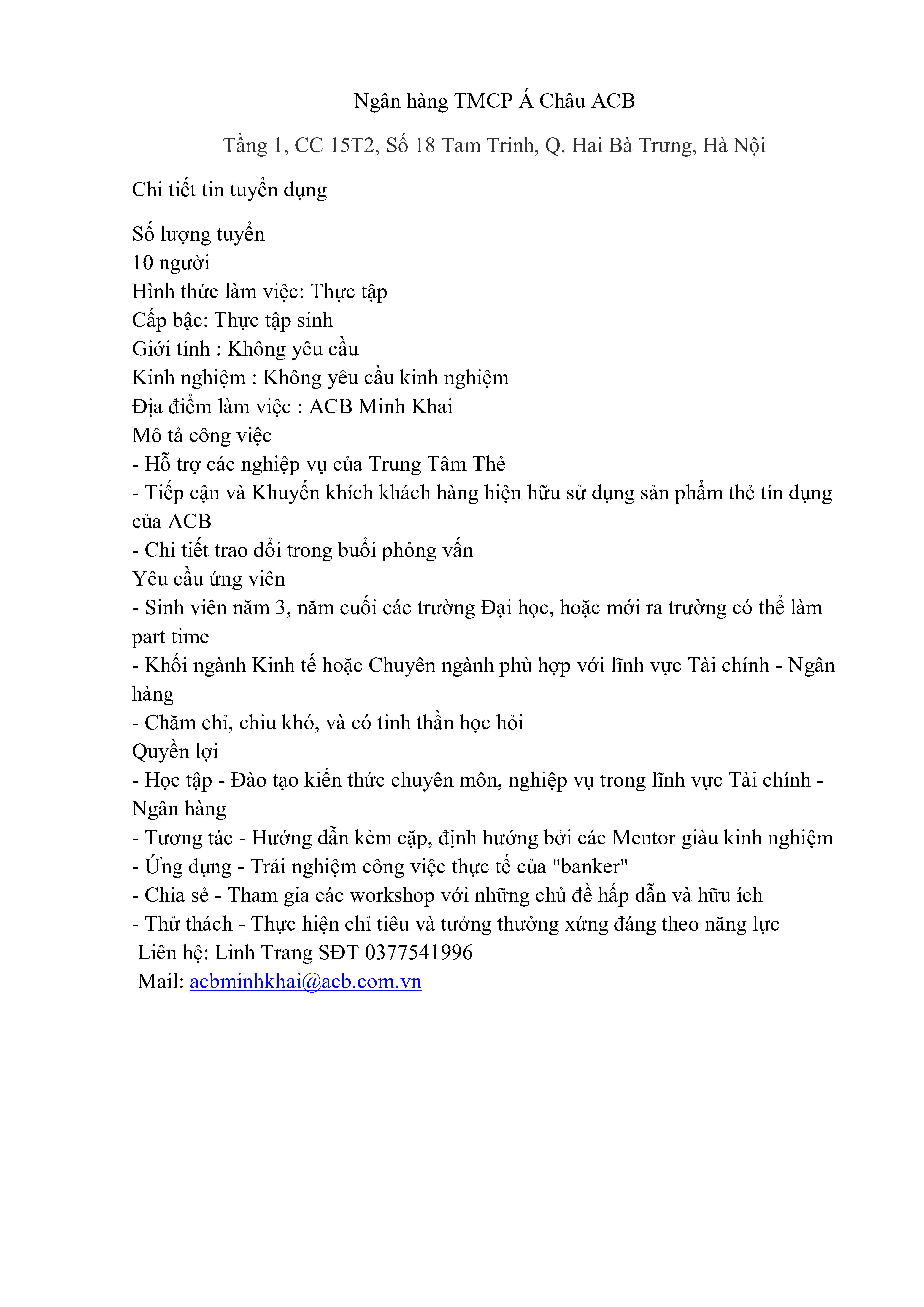 Ngân hàng TMCP Á Châu ACB tuyển dụng thực tập sinh