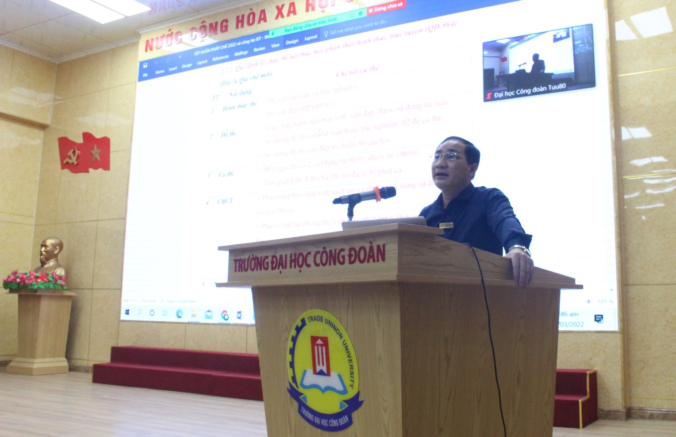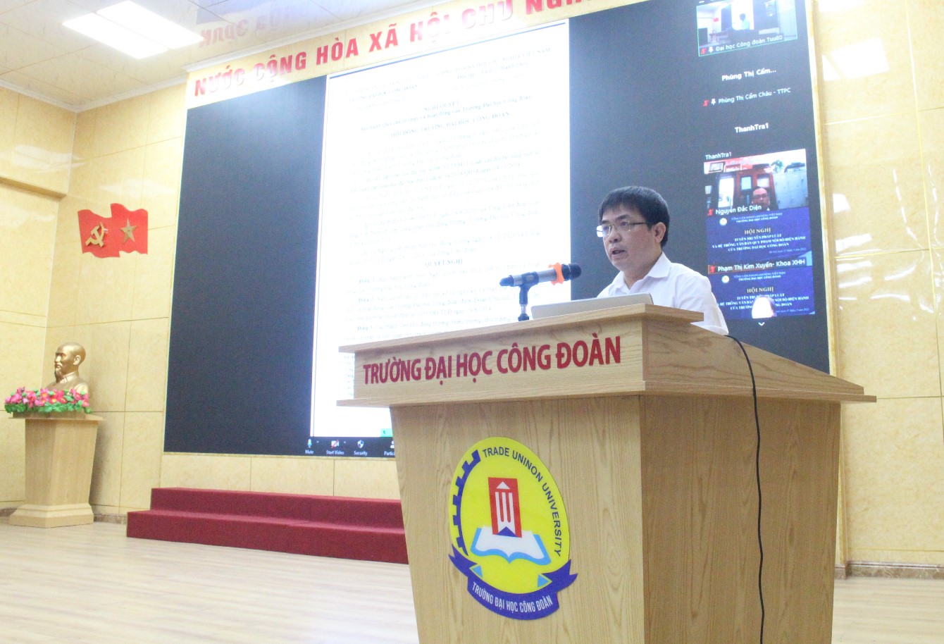 Tham dự hội nghị trực tiếp và trực tuyến qua phần mềm Zoom có: Ủy viên BCH Tổng LĐLĐVN, Bí thư Đảng ủy, Chủ tịch hội đồng Trường – TS. Lê Cao Thắng; Phó Bí thư Đảng ủy, Hiệu trưởng - TS. Lê Mạnh Hùng; TS. Nguyễn Đức Tĩnh- Phó Bí thư Đảng ủy, Phó Hiệu trưởng; TS. Dương Thanh Xuân- Phó Hiệu trưởng; cùng Lãnh đạo các đơn vị và toàn thể viên chức, người lao động Nhà trường.