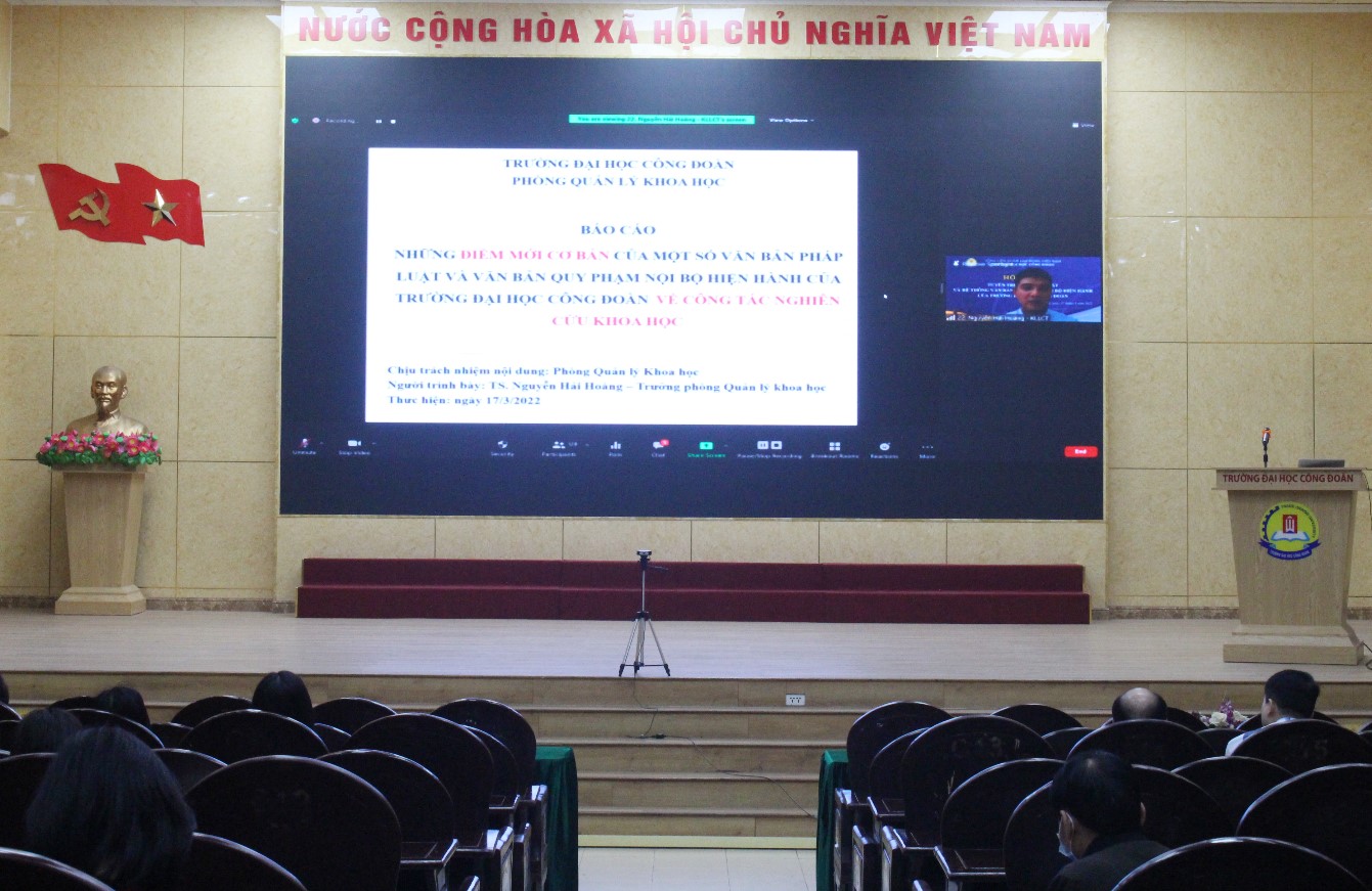 Trao đổi và tuyên truyền tại hội nghị; TS Nguyễn Hải Hoàng - Trưởng phòng Quản lý khoa học nêu những điểm mới cơ bản trong một số văn bản pháp luật và văn bản quy phạm nội bộ hiện hành của Trường về công tác nghiên cứu khoa học như: thay đổi tính định mức nghiên cứu khoa học cho giảng viên, quy trình đăng ký đề tài nghiên cứu khoa học các cấp…