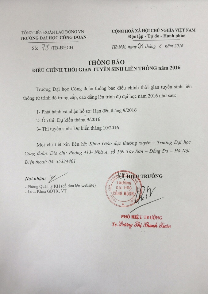 Thông báo điều chỉnh thời gian Tuyển sinh liên thông 2016