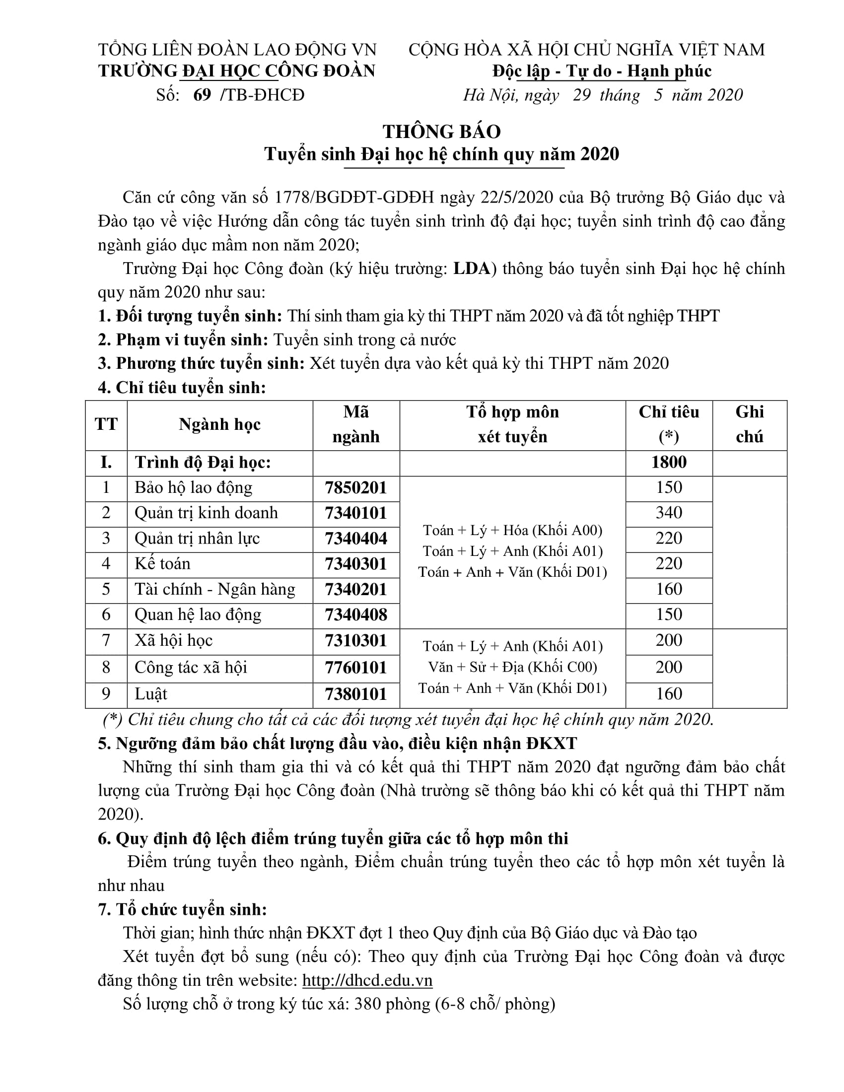 Thông báo Tuyển sinh Đại học hệ chính qui năm 2020