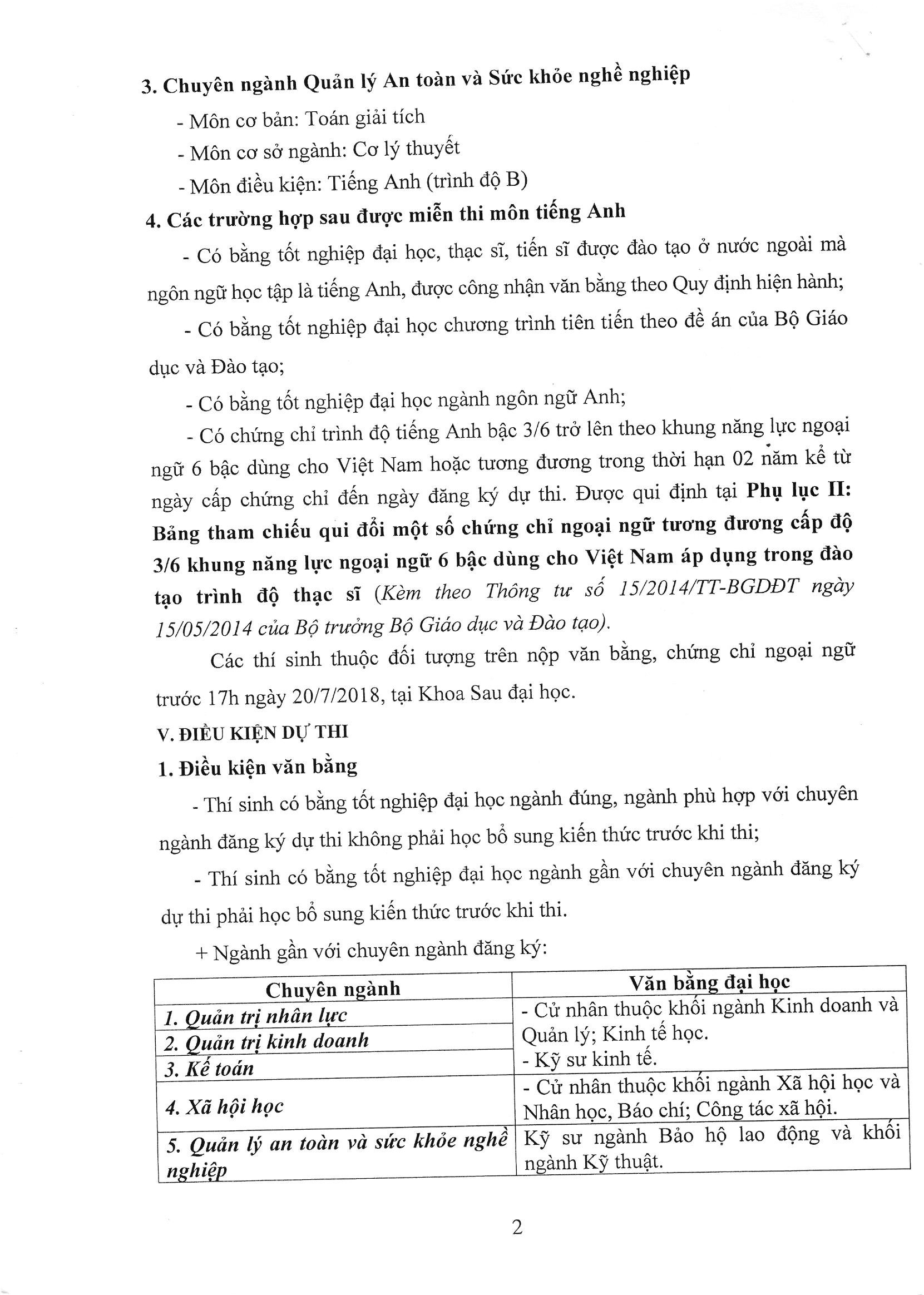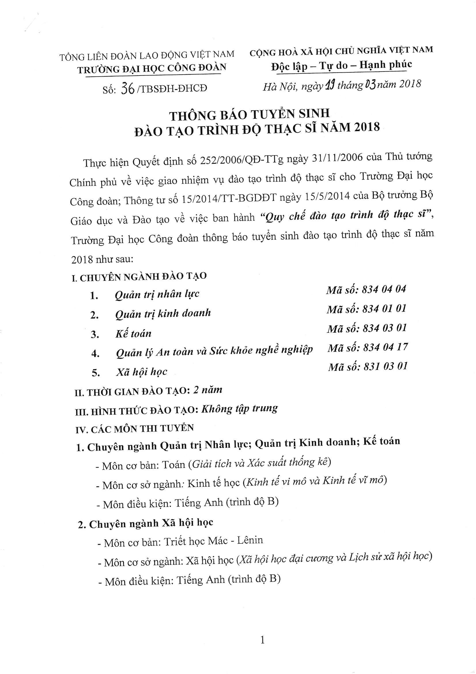 Thông báo Tuyển sinh đào tạo trình độ Thạc sỹ năm 2018