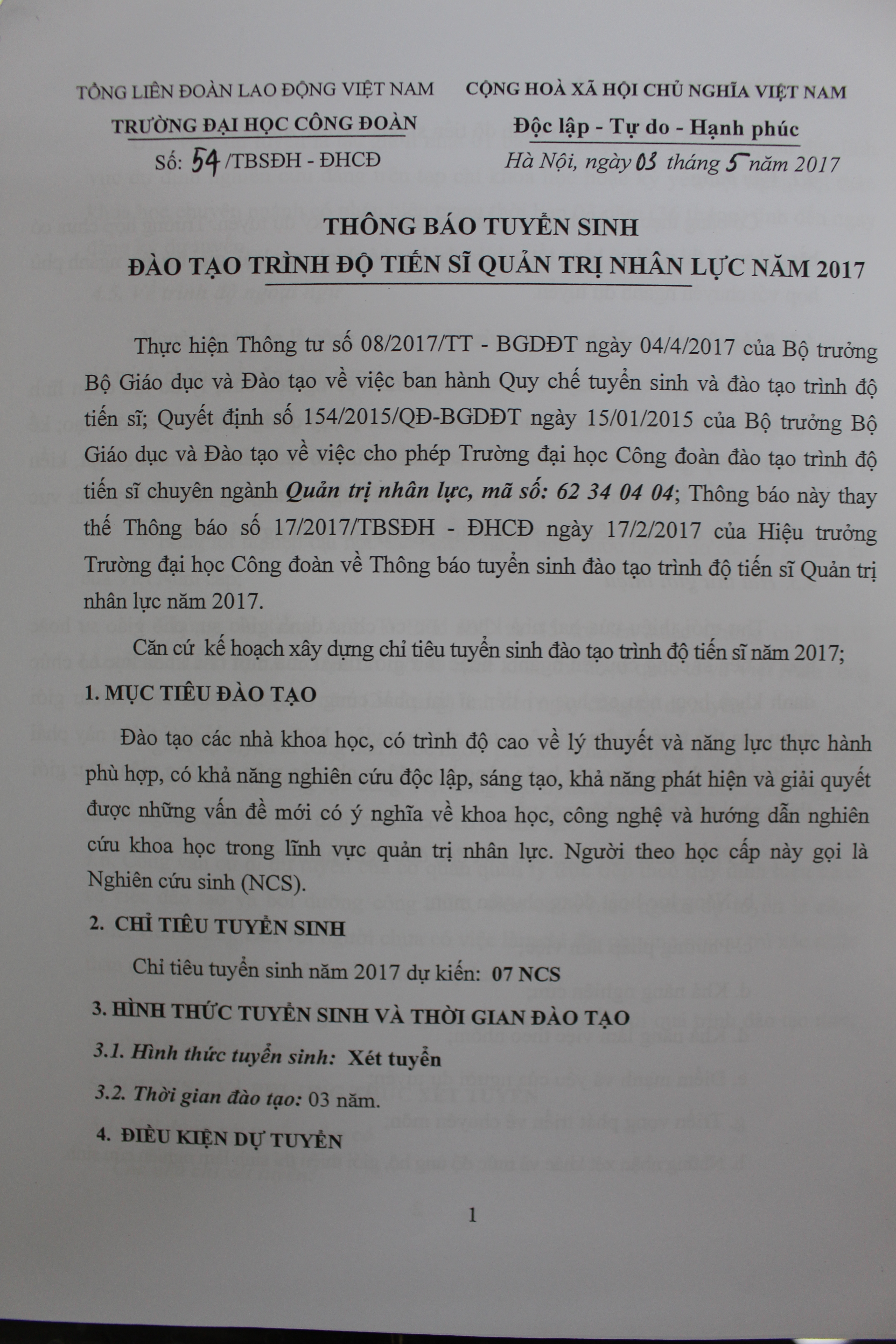 Thông báo Tuyển sinh đào tạo trình độ Tiến sĩ Quản trị nhân lực năm 2017