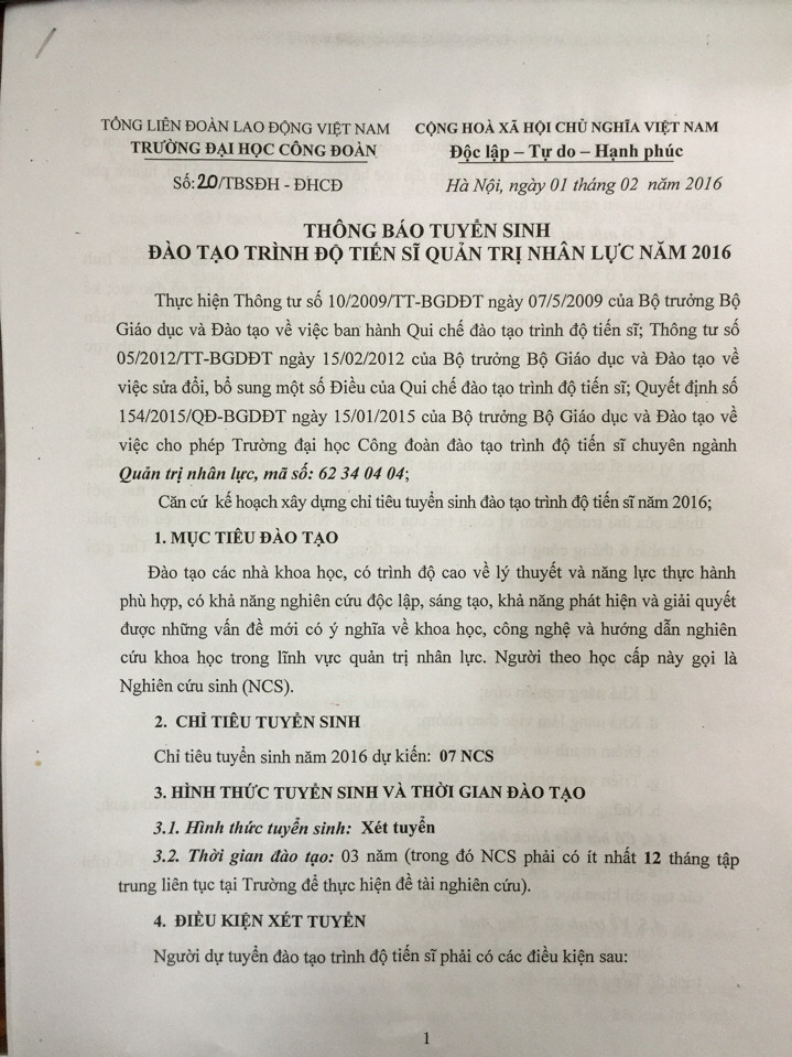 Tuyển sinh đào tạo trình độ Tiến sĩ Quản trị nhân lực năm 2016