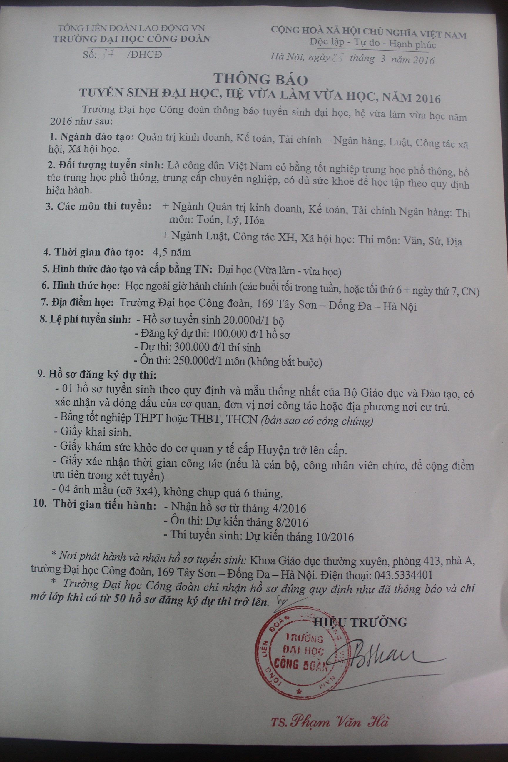 Tuyển sinh hệ Vừa học vừa làm năm 2016